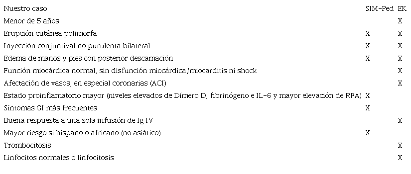 El diagnóstico diferencial del síndrome inflamatorio multisistémico pediátrico vinculado al SARS-CoV-2 incluye el síndrome de shock tóxico estreptocócico y estafilocócico, el síndrome de activación macrofágica, la sepsis de origen bacteriano y la enfermedad de Kawasaki. En nuestro caso, supuso un reto el diagnóstico diferencial entre SIM-Ped y enfermedad de Kawasaki, al compartir datos clínicos y analíticos de ambas entidades (Tabla 1), como ya ha sido descrito por otros autores2.