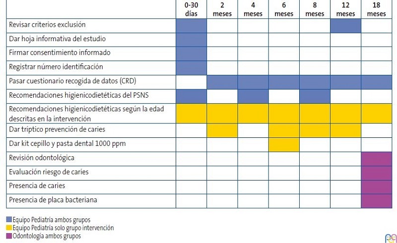 Formación desde la primera visita, capacitándolas para identificar y prevenir factores de riesgo cariogénico. Se les dio información oral durante la visita y se les entregó un tríptico explicativo elaborado por los equipos de Pediatría y Odontología, con recomendaciones sobre alimentación saludable, como evitar la transmisión de gérmenes vía oral entre los cuidadores y los lactantes, así como consejos y habilidades para realizar una adecuada higiene dental en función de la edad del lactante.