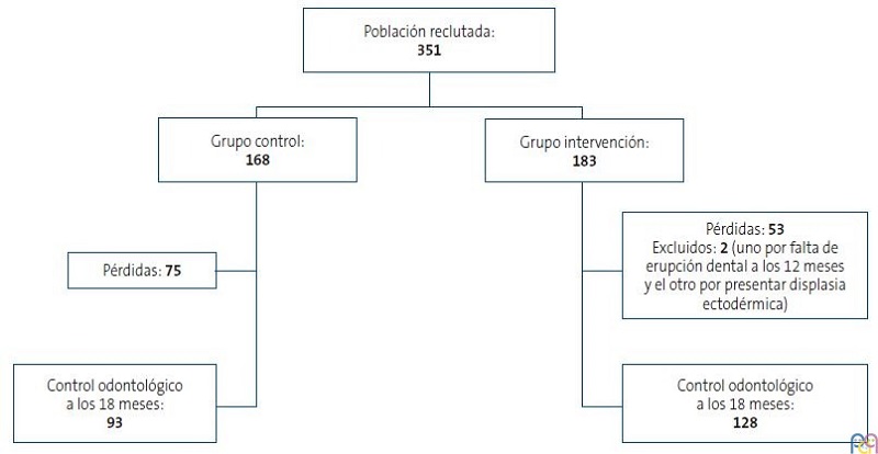 Cumplieron criterios de inclusión 351 familias, de las cuales 183 formaron parte del grupo intervención y 168 del grupo control. A la visita final odontológica de los 18 meses acudieron 128 familias del grupo intervención (69,9%,) y 93 familias del grupo control (55,4%). En la Figura 1 se muestra el flujo de participación.