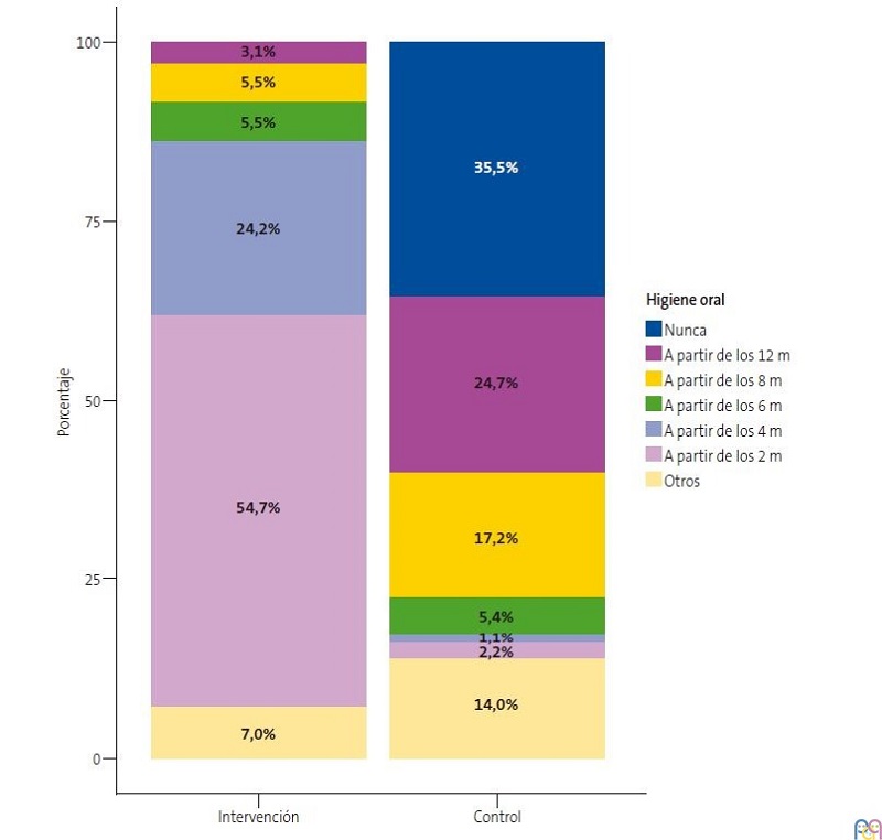 Los hábitos de higiene oral fueron diferentes en ambos grupos (p <0,01) (Figura 2). Dentro del grupo control, se observó que el 35,5% de los niños no recibieron ningún tipo de higiene oral dentro de su primer año de vida, mientras que todos los participantes del grupo intervención recibieron alguna intervención de higiene oral.