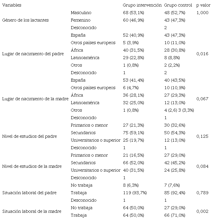En la Tabla 2 se recogen las características sociodemográficas de las familias participantes. En ambos grupos el nivel de estudios medios era el más frecuente para ambos progenitores. Solamente se detectaron diferencias significativas entre el grupo control e intervención en dos variables, la situación laboral de las madres y el lugar de nacimiento de los padres. En el grupo control había mayor proporción de madres trabajadoras y un porcentaje mayor de progenitores nacido en España.
