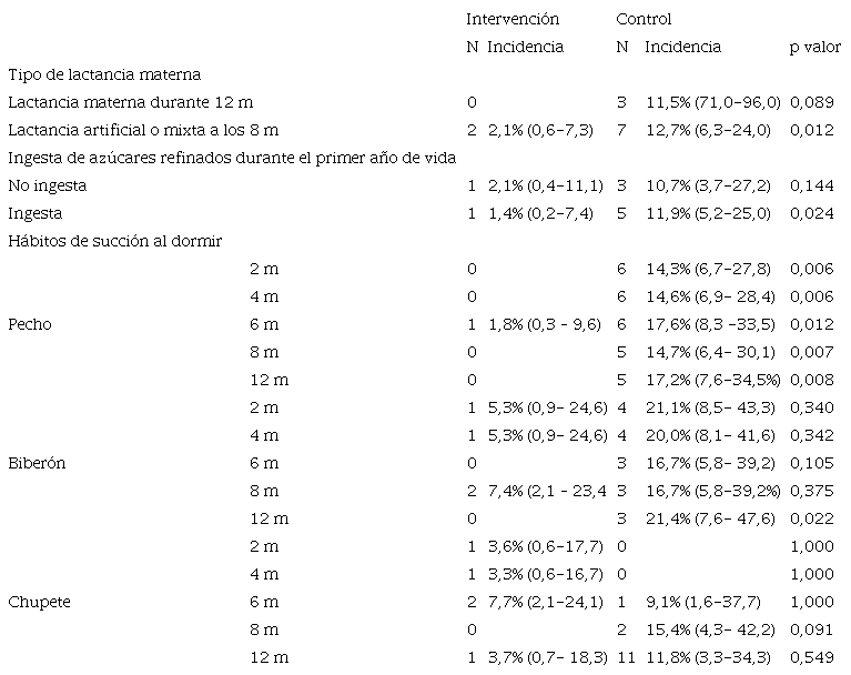 En los lactantes que se alimentaron exclusivamente de leche materna durante los primeros 12 meses de vida, la incidencia de caries no fue significativamente diferente entre el grupo control y el de intervención. En cambio, aquellos lactantes que recibieron lactancia artificial o mixta antes de los 8 meses de vida, la incidencia de caries fue significativamente mayor en el grupo control que en el de intervención (p = 0,012).