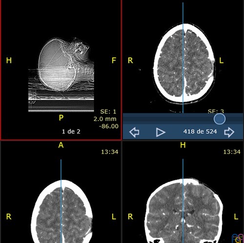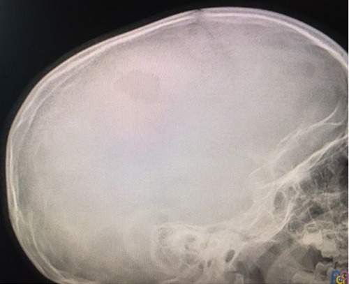 Paciente de 4 años que acude con su madre a consulta por bultoma en cuero cabelludo descubierto de forma casual 7 días antes, sin relación con antecedente traumático y con dolor a la palpación. Desde entonces presenta despertares nocturnos con irritabilidad, que mejoran con analgésicos. Antecedentes familiares y personales sin interés. Desarrollo madurativo normal. Vacunas adecuadas para su edad. No alergias conocidas. El paciente presenta muy buen estado general, apirético y con exploración normal, tanto somática como neurológica, salvo tumoración de consistencia blanda en región parietal izquierda de 2,5-3 cm de diámetro, dolorosa a la palpación. Se deriva al hospital de referencia para pruebas de imagen. La Rx de cráneo muestra una lesión osteolítica en sacabocados, posiblemente compatible con GE (Figura 1). Rx de tórax, serie ósea y ecografía abdominal normales. TAC craneal evidencia los mismos signos (Figura 2). La RMN detecta una lesión única intraósea expansiva parietal izquierda, que atraviesa la tabla ósea externa e interna con mínimo engrosamiento, e hipercaptación de la duramadre subyacente, sugerente de GE como primera posibilidad radiológica. Hemograma y bioquímica dentro de la normalidad.
