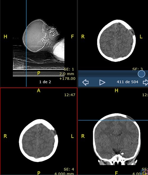 El paciente permanece asintomático hasta un mes después, cuando se objetiva un nuevo bultoma doloroso al tacto, medial a la lesión previa, realizándose nuevo TAC cerebral y confirmándose una lesión lítica de nueva aparición en la región parietal parasagital izquierda, medial a la lesión anterior, sin componente de partes blandas (Figura 3).