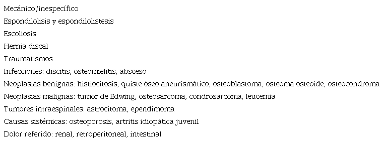 Nuestra paciente inicialmente refería un dolor generalizado de espalda inespecífico, que a la exploración se focalizo más a nivel lumbar. Por otro lado, el tiempo de evolución nos obligó a descartar otras causas de dolor lumbar en Pediatría15: espondilolisis y espondilolistesis, enfermedad de Scheuermann, escoliosis, hernia discal, trauma, infección (discitis, osteomielitis vertebral, infección sacroilíaca y absceso epidural), neoplasias benignas (histiocitosis de células de Langerhans, quiste óseo aneurismático, osteoblastoma, osteoma osteoide y osteocondroma), neoplasias malignas (tumor de Ewing, osteosarcoma, condrosarcoma y leucemia) y metástasis, tumores intraespinales (astrocitoma, ependimoma), causas sistémicas (osteoporosis, artritis idiopática juvenil) y dolor lumbar referido (Tabla 1).