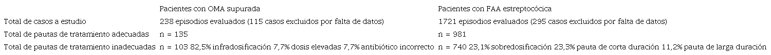 Resultados: En el grupo de pacientes con OMA supurada han sido evaluados 238 episodios obteniendo un grado de adecuación terapéutica del 56,7% y siendo la infradosificación la principal causa de inadecuación. En el grupo de pacientes con FAA estreptocócica han sido evaluados 1721 episodios obteniendo un grado de adecuación terapéutica del 57%, siendo las principales causas de inadecuación la sobredosificación y las pautas de corta duración.