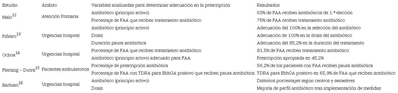 Los estudios publicados de adecuación de la prescripción antibiótica de FAA han arrojado resultados dispares. Una evaluación de la prescripción antibiótica, realizada en AP en Aragón en pacientes de 0 a 14 años con diagnóstico de infección de vías respiratorias altas publicado en 2014, determinó que los pacientes con FAA (75%) han sido los que con mayor proporción recibieron tratamiento antibiótico12. Piñeiro13 evaluó en el año 2015 todos los informes de alta y pruebas complementarias realizadas en los niños menores de 14 años diagnosticados de FAA en un servicio de urgencias pediátricas, concluyendo que la prescripción antibiótica fue del 46,3%. En el 100% de los tratados se realizó estudio microbiológico y correcta selección antimicrobiana, y la duración e intervalo entre dosis tuvo una adecuación mayor del 85%. Ochoa14 realizó un estudio prospectivo multicéntrico en 11 hospitales españoles publicado en 2003, demostrando una baja utilización de antibióticos de primera elección para FAA estreptocócica.