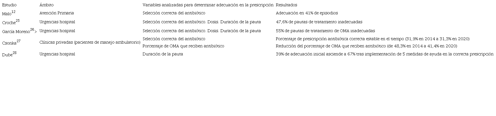 En cuanto a los datos publicados de prescripción antibiótica adecuada en OMA en Pediatría existe también una variación en los resultados de los distintos estudios. Malo12 analizó la prescripción antibiótica en AP en Aragón durante un año para los pacientes diagnosticados de OMA, concluyendo que el porcentaje de prescripción antibiótica era del 72% y que el grado de adecuación terapéutica era bajo. Croche25 evaluó en el año 2013 el grado de adecuación de la prescripción antibiótica en urgencias de un hospital comarcal, concluyendo que el grado de inadecuación fue del 51,9% y la principal enfermedad en la que se produjo prescripción inadecuada fue OMA (47,6%). García-Moreno26 analizó el grado de adecuación de la prescripción antibiótica en un servicio de urgencias pediátricas durante un año en pacientes con diagnóstico de proceso infeccioso. Concluyó que la adecuación terapéutica fue del 49,3%, siendo los fallos más frecuentes en pacientes con diagnóstico de OMA (especialmente en menores de 2 años), infección urinaria y conjuntivitis aguda. Csonka27 analizó la prescripción ambulatoria de antibióticos en pacientes pediátricos con OMA entre 2014 y 2020 en Finlandia, concluyendo que la selección del antibiótico fue adecuada en el 80,1% cuando el prescriptor era pediatra, 67% cuando era médico generalista y, llamativamente, del 55,1% cuando era otorrinolaringólogo. Dube28 analizó el impacto de 5 medidas para mejorar la adecuación en la duración de la prescripción antibiótica en pacientes con OMA en urgencias, detectando una mejora del 39% hasta 67% en las variables analizadas. En la Tabla 3 se exponen los principales resultados de estos estudios en OMA.