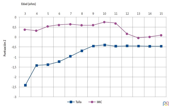 A través de los sistemas operativos WHO AnthroII (0-5 años) y WHO AnthroPlus (5-19 años)11, los valores medios obtenidos de los parámetros antropométricos se compararon con los estándares de crecimiento infantil de la Organización Mundial de la Salud (OMS), calculando la puntuación Z (pZ) y el percentil (P) para edad y sexo. Dichos sistemas operativos no calculan la pZ y el P del perímetro cefálico a partir de los 5 años ni del peso a partir de los 10 años. De acuerdo con los estándares de crecimiento infantil de la OMS, una pZ del parámetro inferior a -2 DE define retraso severo, entre -1 y -2 DE retraso moderado, y superior a -1 DE retraso leve. Se definió crecimiento recuperador significativo cuando la pZ del parámetro tuvo un incremento anual superior a +0,5 DE12.