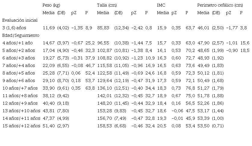 Peso: en la evaluación inicial mostró retraso moderado el 75%, y el resto, retraso severo; en el primer año tras la adopción se observó crecimiento recuperador significativo (pZ +0,68); en la evolución longitudinal persistió retraso leve hasta los 7 años de edad, momento a partir del cual no se observó retraso. Talla: en la evaluación inicial mostró retraso severo el 58,3%, y el resto, retraso moderado; en el primer año tras la adopción se observó crecimiento recuperador significativo (pZ +0,98); en la evolución longitudinal se mantuvo recuperación hasta los 10 años de edad, persistiendo retraso moderado hasta los 6 años; desde los 10 hasta los 15 años de edad el crecimiento se mantuvo estable, persistiendo retraso leve. IMC: en la evolución longitudinal se objetivó que el grado de retraso de la talla siempre fue superior al del peso. Perímetro cefálico: en la evaluación inicial mostró retraso moderado el 66,7%, y el resto, retraso severo; en el primer año tras la adopción se observó crecimiento recuperador significativo (pZ +0,76); a los 5 años de edad persistía retraso leve.