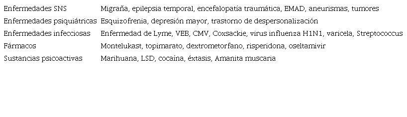 Adicionalmente, en orden decreciente de prevalencia, encontramos otras causas como: lesiones cerebrales, fármacos, (montelukast, topimarato, dextrometorfano, risperidona y antidepresivos), sustancias psicoactivas y desordenes psiquiátricos. El SAPM incluye 42 síntomas visuales8 y 16 somáticos u otros síntomas no visuales, teniendo en común que todos ellos producen una distorsión de la percepción sensorial más importante que las alucinaciones o ilusiones10.