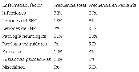 Múltiples condiciones médicas se han asociado a este síndrome cuya causa exacta es aún desconocida. Hasta ahora se han clasificado en 8 grupos. Entre ellas, las más frecuentes (Tabla 1)7 son la migraña, predominante en todos los rangos de edad y las infecciones, predominantes principalmente en edad pediátrica, sobre todo debidas al virus de Epstein Barr (VEB) (Tabla 2)8,9.