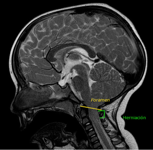 MC-I (la más frecuente): herniación caudal de las amígdalas cerebelosas mayor de 5 mm por debajo del foramen magnum. No suele acompañarse de descenso del tronco del encéfalo, cuarto ventrículo ni hidrocefalia.