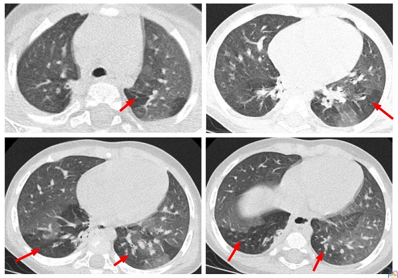 En el seguimiento en la consulta de Atención Primaria, se objetiva la presencia y persistencia de distrés respiratorio y auscultación patológica con roncus y sibilantes dispersos en las bases pulmonares que persisten tras meses de tratamiento con broncodilatadores inhalados, budesonida inhalada y montelukast vía oral. Fue derivado para valoración especializada por Neumología Pediátrica, que solicitó tomografía computarizada (TC) pulmonar de alta resolución, apreciándose “patrón en mosaico” con áreas de atrapamiento aéreo de predominio en ambos lóbulos inferiores y en lóbulo superior derecho (Figura 1), combinadas con áreas de pulmón normal y atelectasia basal derecha paravertebral con finas bronquiectasias por tracción, todo ello compatible con el diagnóstico de BO. Ante los hallazgos de la TC, se continúa tratamiento con budesonida inhalada a dosis medias, montelukast oral y se añade azitromicina oral 3 días por semana como agente antiinflamatorio. Clínicamente, presenta buena evolución con desaparición del distrés respiratorio, mejoría de la ventilación pulmonar y con saturaciones de oxígeno normales.