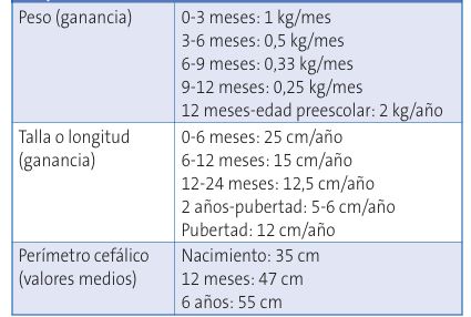La evolución normal estimada de la antropometría en los primeros años de vida se muestra en la Tabla 1.