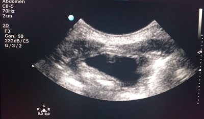En el estudio ecográfico mediante ultrasonidos se visualiza imagen anecoica de 2 x 3 cm no tabicada, sin apreciarse asas intestinales en su interior, siendo esta imagen compatible con hematoma del cordón umbilical.