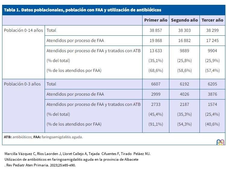 La muestra del estudio son todos los niños del área de ambos sexos (0-14 años) que, durante el periodo del estudio de tres años de duración, han recibido la prescripción de al menos un antibiótico por un proceso de FAA. A continuación, se describen las variables que se han recogido para la realización del estudio, obtenidas del sistema de Información de AP (Turriano) del Servicio de Salud de Castilla la Mancha (SESCAM). Todos los datos se han codificado de forma anonimizada.