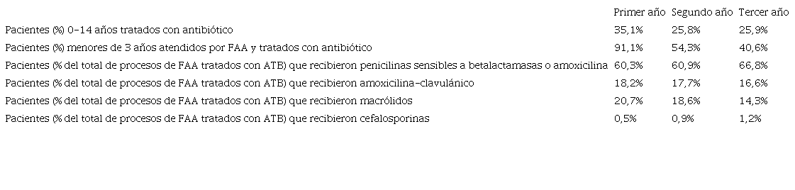 Resultados: Durante los tres años del proyecto se atendieron un total de 53 995 procesos de FAA, de los que 33 426 (61,9%) fueron tratados con antibióticos. Considerando los niños menores de 3 años, se atendieron un total de 10 901 procesos de FAA (20,2% del total de las FAA), de los que recibieron antibiótico 6494 (59,6%). En cuanto a la selección del antibiótico se utilizó preferiblemente penicilinas sensibles a betalactamasas (fenoximetilpenicilina, fenixometilpenicilina-benzatina) y amoxicilina: 60,3% el primer año, 60,9% el segundo y 66,8% el tercero; con menor uso de otros grupos antibióticos: amoxicilina-ácido clavulánico en 2475 procesos (18,2%) durante el primer año, 1754 (17,7%) durante el segundo y 1644 (16,6%) durante el tercero. También se observó menor uso de macrólidos: 2825 (20,7%) en el primer año del proyecto, 1933 (19,6%) en el segundo y 1419 (14,3%) en el último.