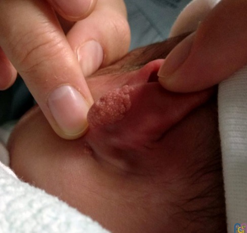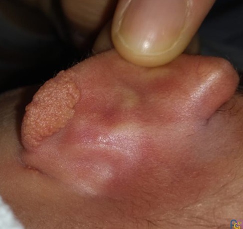 En el examen físico de las primeras 24 horas se objetiva, en el lóbulo de la oreja izquierda, una lesión única e indolora, hamartomatosa de color anaranjado y tacto verrucoso de unos 2 cm de diámetro mayor (Fig. 1 y 2). Atendiendo a las características clínicas se diagnostica de nevo sebáceo y es dado de alta de Maternidad con consulta preferente en Dermatología, quien confirma la sospecha clínica.