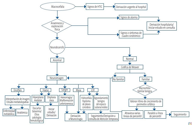 Un niño con macrocefalia no evolutiva, familiar, sin alteraciones en el desarrollo, clínica ni alteraciones reseñables en las técnicas de imagen podrá ser subsidiario de mantener seguimiento estrecho en el que deberá prestarse atención a la evolución del perímetro cefálico y a la aparición de nuevas manifestaciones o de pérdidas de hitos del desarrollo.
