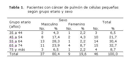 El cáncer de pulmón de células pequeñas predominó en el sexo masculino, con 80,4 %, y en el grupo etario de 65 a 74 años, con 32,7 % (tabla 1).