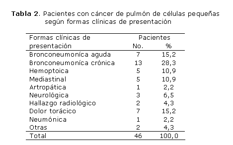 Por tratarse generalmente de tumores de localización central (hiliar), se define el diagnóstico histológico a través de la broncoscopia con biopsia y el esputo citológico, existe un predominio de las manifestaciones de síndrome mediastinal y suele presentarse la neumonitis obstructiva. Se ha llegado al consenso de que en los pacientes con CPCP debe aplicarse poliquimioterapia por su superioridad sobre la monoterapia.11 En esta investigación se refuerza la hipótesis de que la quimioterapia basada en platino permanece siendo la piedra angular para el tratamiento; las combinaciones de cisplatino y etopósido son las que producen mejor resultado, incluso ante combinaciones de cisplatino con otras drogas que no sean etopósido.