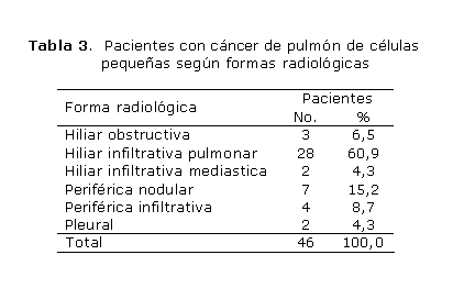 Como forma radiológica de presentación, primó la hiliar infiltrativa pulmonar en 60,9 % de los pacientes (tabla 3).