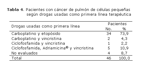 Generalmente se empleó la combinación de quimioterapia a base de carboplatino y etopósido, con 73,9 % de la casuística (tabla 4).