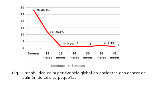 Santos et al,17 en su estudio realizado en el año 2015 en Portugal, exponen que los pacientes con cáncer de células pequeñas presentan una supervivencia baja. Por su parte, Cobo Dois et al18 plantean que la mediana de supervivencia en la enfermedad limitada es de 18 meses cuando estos son tratados con una combinación de quimioterapia y radioterapia, mientras que los pacientes con una enfermedad extendida, tratados primeramente con quimioterapia, muestran altas tasas de respuestas globales de 60 a 70 %, y respuestas completas de 20-30 %, pero la mediana de supervivencia no suele superar los 9 meses.