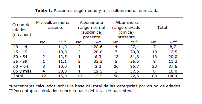 En la serie (tabla 1), el grupo etario predominante, relacionado con la microalbuminuria patológica, fue el de 60-64 años (26 pacientes, para 86,7 %).