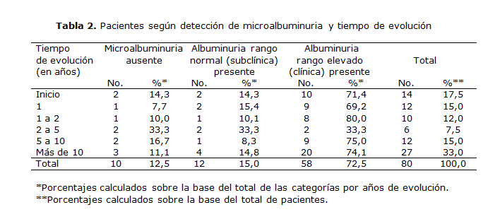 En la tabla 2 se aprecia la prevalencia de los pacientes con más de 10 años de evolución de la enfermedad (20, para 74,1 %). Cabe resaltar que se detectó la microalbuminuria de rango elevado en 10 enfermos al inicio de la enfermedad.