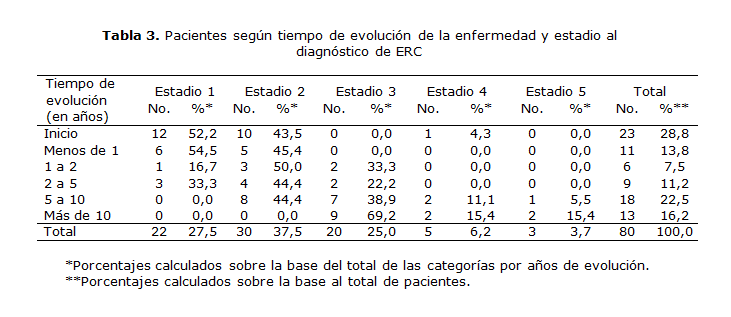 Investigaciones recientes informan que los pacientes diabéticos presentaron ERC progresivamente, justo después de los 7 años del diagnóstico inicial; otros después de los 10 años,3,12,16 lo cual coincide con lo descrito en la bibliografía nacional e internacional. En esta casuística, la mayoría de los afectados progresaron a diferentes estadios de la ERC después de los 10 años; resultado similar a lo descrito anteriormente.