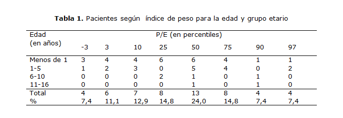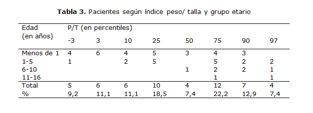 En relación con el índice peso para la talla y grupo etario (tabla 3) se muestra que 12 de los pacientes (22,2 %) se encontraban en el percentil 75, mayormente de las edades comprendidas entre 1-5 años.