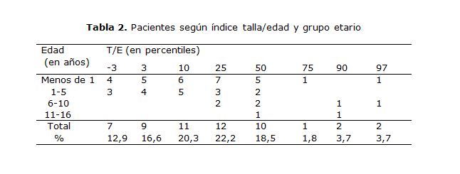 En cuanto al índice talla para la edad y grupo etario (tabla 2), predominaron los pacientes con tallas inferiores y hasta el percentil 25, para 72,2 %, principalmente los menores de 1 año.