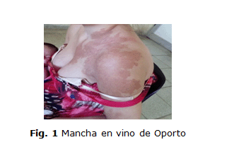 - Mancha en vino de Oporto extensa que ocupaba parte de la cara anterior del tronco, el cuello y todo el miembro superior izquierdo (figura 1).