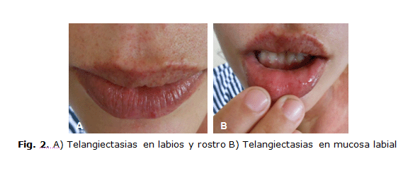 - Telangiectasias: múltiples y en sitios característicos (labios, cavidad bucal, dedos, nariz)
