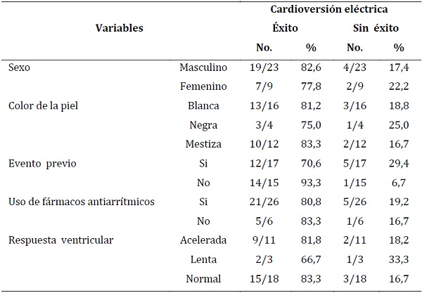 Según se observa en la tabla 1, la existencia de al menos un evento arrítmico previo se asoció con una disminución de la eficacia del choque eléctrico, puesto que de los 17 pacientes que presentaron evento previo 70,6 % tuvo éxito; sin embargo, de los 15 que no mostraron estos eventos en 93,3 % fue exitoso. Además, de los 6 pacientes sin éxito, 5 presentaron un evento previo de FA. También, en esta serie predominó el uso de fármacos antiarrítmicos en el subgrupo con CVE acertada. El sexo, el color de la piel y la respuesta ventricular no se relacionaron con el éxito de la CVE.