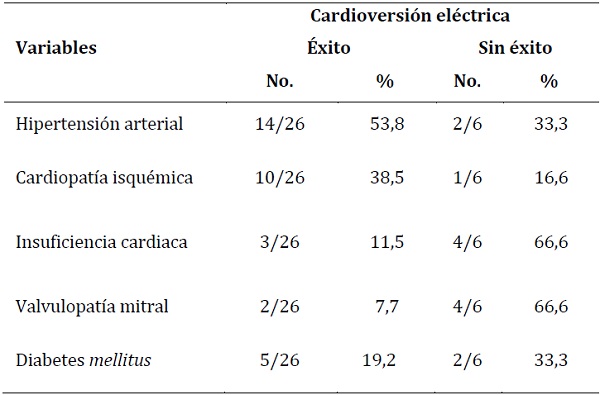 En la tabla 2 se muestra que la HTA y la cardiopatía isquémica fueron las entidades más frecuentes asociadas a estos afectados (16 para 50 % y 11 para 34,3 %, respectivamente). La presencia de insuficiencia cardiaca y valvulopatía mitral se relacionó con una CVE no exitosa, con 66,6 % del total de CVE fallidas respecto al total de cada una de estas 2 afecciones. En cambio, los antecedentes patológicos personales de HTA, cardiopatía isquémica y diabetes mellitus no influyeron de manera significativa en el éxito del proceder.