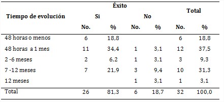 Con el incremento del tiempo de evolución disminuyó el éxito de la CVE. Esta disminución se observó a partir de los 6 meses; a un paciente que tenía más de 12 meses sin éxito se le aplicó la CVE teniendo en cuenta que la aurícula izquierda no estaba dilatada en el ecocardiograma (tabla 3).