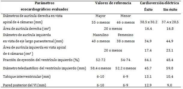 La FEVI, variable ecocardiográfica que cuantifica la severidad de la disfunción sistólica, es una herramienta útil para evaluar el riesgo potencial de desarrollar la arritmia y la factibilidad de revertir a ritmo sinusal. Una disminución de este parámetro se asocia con un incremento en la incidencia, la prevalencia y la recurrencia de la FA, además de hacer menos efectivas las técnicas de reversión a ritmo sinusal. El incremento del diámetro telediastólico del ventrículo izquierdo expresa un mayor deterioro de la función sistólica y un riesgo potencial para desarrollar FA. Durante la investigación se encontró en los pacientes con CVE fallida un DTDVI superior.
