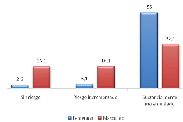 En relación con el perímetro de la cintura, en esta casuística existió un marcado predominio del sustancialmente incrementado en ambos sexos, aunque ligeramente superior en el caso de las féminas.