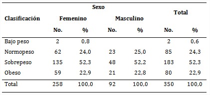 En la casuística, 258 de los 350 pacientes, eran féminas, para 73,7 %. La edad mínima fue de 27 años y la máxima de 93, con una media de 63,3±8,2 y una primacía del grupo etario de 60-69 (124 integrantes, para 35,4 %); pero sin diferencias significativas entre ambos sexos. Respecto al índice de masa corporal (IMC), el promedio fue de 27,38 ±3,5, sin predominio entre los sexos (tabla 1).