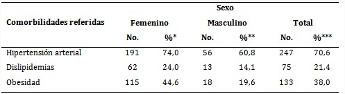 En la casuística primaron las mujeres hipertensas (74,0 %), obesas (44,6 %) y dislipidémicas (24,0 %), en todos los casos por encima de los hombres (tabla 2).