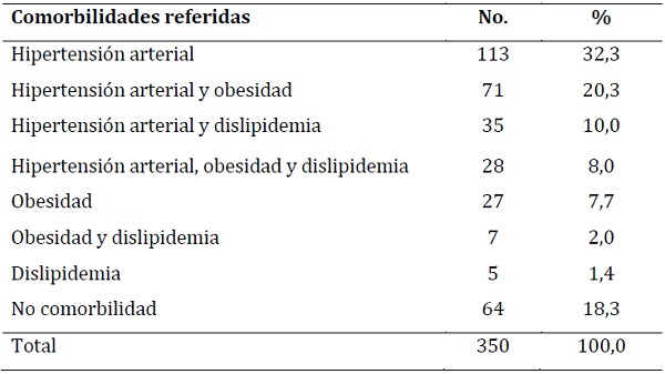 Más detalladamente, en cuanto a la asociación de comorbilidades (tabla 3), se halló que primaron los pacientes con hipertensión arterial y obesidad (20,3 %), seguidos de los que padecían dislipidemia e hipertensión arterial (10,0 %), y dislipidemia, obesidad e hipertensión arterial (8,0 %); sin embargo, 18,3 % no refirieron afección alguna asociada a la enfermedad de base.