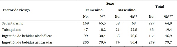 En la población estudiada (tabla 4), los factores de riesgos asociados a complicaciones, como ingestión de bebidas azucaradas, sedentarismo y tabaquismo, no presentaron diferencias sustanciales entre los sexos; mientras que 99 mujeres (38,4 %) y 65 hombres (70,6 %) consumían bebidas alcohólicas, con diferencias significativas entre ambos sexos.