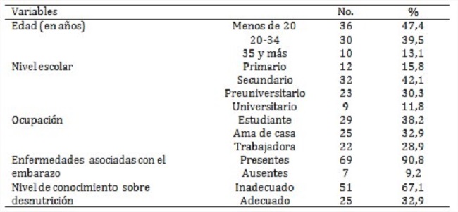 En la casuística (tabla 1), predominaron las madres menores de 20 años (47,4 %), con nivel escolar secundario (42,1 %), sin vínculo laboral (71,1 %), con enfermedades asociadas con el embarazo (90,8 %) y con nivel de conocimiento inadecuado sobre la desnutrición (67,1 %).