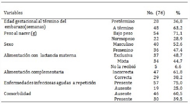 Como se muestra en la tabla 2, prevalecieron los nacidos a término (63,2 %), con peso inferior a 2 500 g (71,1 %), el sexo masculino (52,6 %), los alimentados con lactancia materna exclusiva hasta los 6 meses (48,7 %), los que recibieron alimentación complementaria incorrecta (61,8 %), así como los que presentaron enfermedades infecciosas agudas a repetición (75,0 %) y ausencia de comorbilidad (60,5 %).