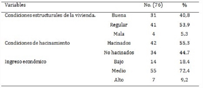 En general (tabla 3), las condiciones estructurales de las viviendas fueron regulares (53,9 %); asimismo, más de la mitad de los niños vivían en condiciones de hacinamiento (55,3 %) y la mayoría de las familias recibía un ingreso económico medio (72,4 %).