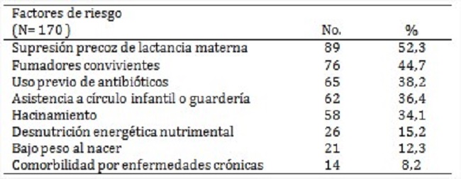Por otro lado, entre los factores de riesgo predominantes (tabla 1) figuraron la supresión precoz de lactancia materna (52,3 %), la existencia de fumadores convivientes con el menor (44,7 %) y el uso previo de antibióticos (38,0 %).