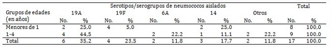 En el estudio realizado por Abreu et al,10) primaron los niños mayores de un año con aislamientos de Streptococcus pneumoniae, el derrame pleural resultó más frecuente y se registraron 3 serotipos: 14, 6A y 19A.